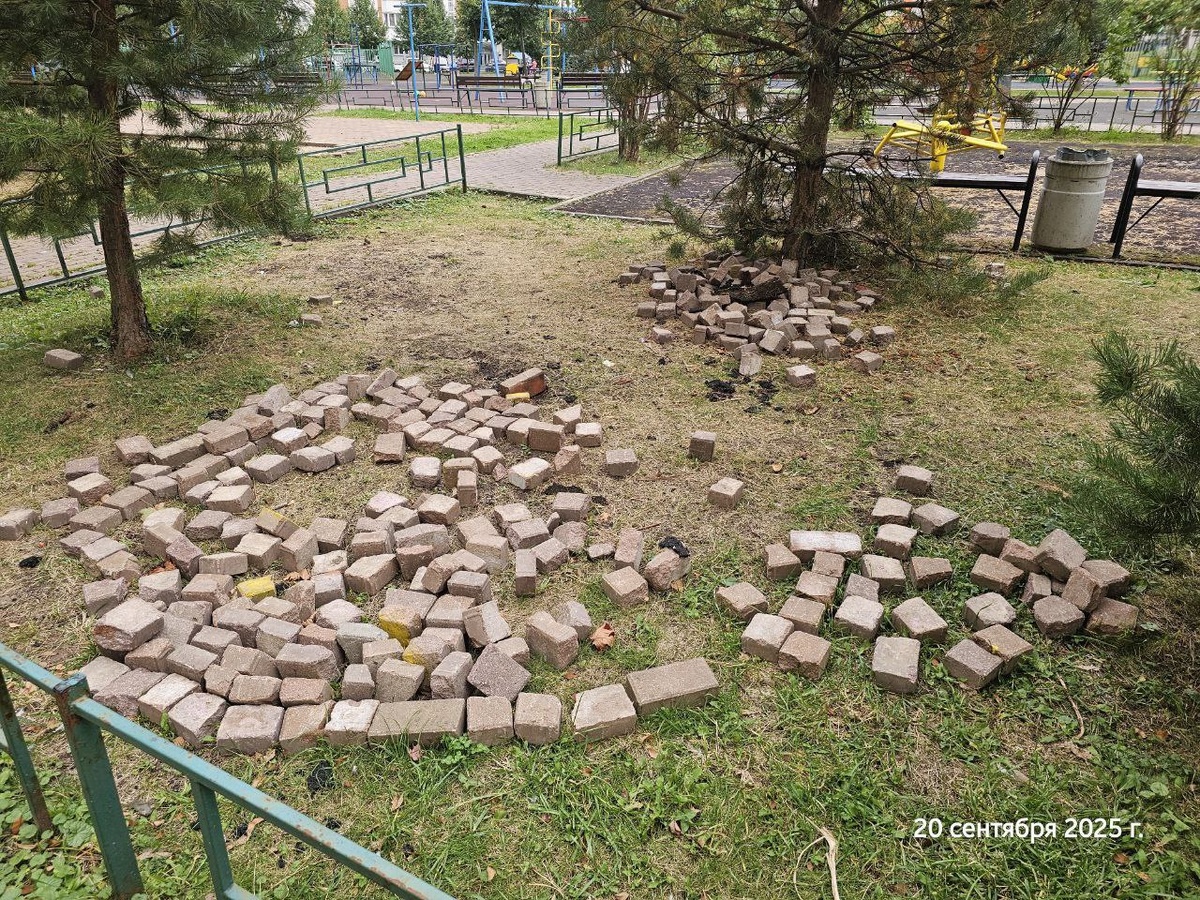 👀Дети в Дрожжино от безделья разобрали брусчатку и сложили бордюрный камень на газоне, играют в пазлы