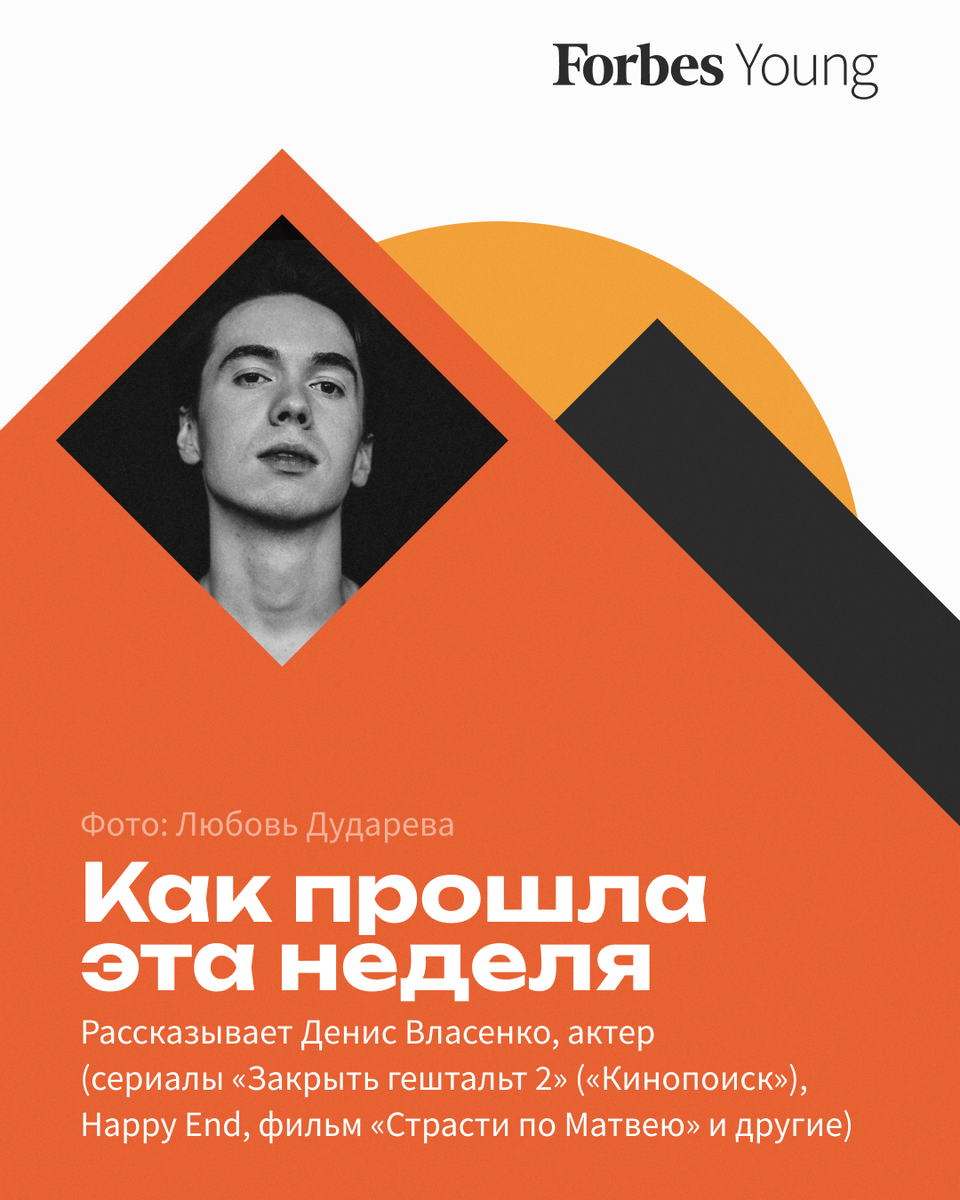 Сегодня в рубрике «Как прошла эта неделя» о своей жизни рассказывает 27-летний актер Денис Власенко. Как прошла твоя неделя? Неделя прошла чудесно, я был на каникулах в Сочи: собирал на винограднике виноград, ел устриц (прямо из моря), загорал и спал, а еще ел чебуреки! Ужас (смеется). А сейчас уже снова в Москве. Чем ты занимаешься? Прямо сейчас я готовлюсь к съемочному дню — учу текст, разбираю логику персонажа. В общем, настраиваюсь на рабочий лад. Что самое крутое в профессии актера и что самое тяжелое? Однажды меня спросили: «Денис, а кем бы ты был, если бы не был актером?». И что-то я задумался надолго. Потом понял, что уже побывал в роли полицейского, алтарника, императора, автомеханика. Это и есть самое крутое — я могу попробовать все: побывать везде, в разных ролях и «шкурах». Самое тяжелое — это, конечно, график и режим, 12-часовой съемочный день, не учитывая дороги. Я, разумеется, не жалуюсь, но тем не менее на личную жизнь остается крайне мало времени. Думаю, что