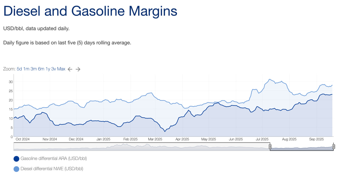 Интересный график, на котором можно хотя бы +- косвенно понимать, что там с маржой переработчиков. Тут показывается маржа переработки бензина и дизеля с 1 барреля нефти, и, как мы видим, 3 квартал должен быть получше двух предыдущих. Короче говоря, чем выше график, тем лучше для переработчиков, так как выгодно получать эти компоненты нефти. Кто выигрывает на нашем рынке сильнее всего? Лукойл, Газпромнефть, Татнефть. Они обладают лучшими НПЗ в стране. Любопытно будет глянуть отчет за 3 квартал. Крепкий рубль, конечно, всё равно давит на прибыль, но девальвация, возможно, всё еще впереди!! Можно подписаться на мой ТГ-канал, там читать мою ахинею будет удобнее, так что милости прошу.