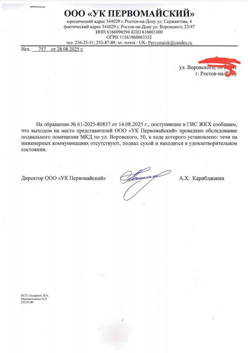 — В УК «Первомайский» написали, что течей нет, подвал сухой и находится в удовлетворительном состоянии. Подписался под этим директор компании. Получается, на бумаге все идеально. При этом, подчеркивает жительница, налицо целый перечень нарушений: невыполнение обязанностей по содержанию общедомового имущества (ЖК РФ, ст. 161); предоставление недостоверной информации в отчётах; игнорирование заявок жителей и обращений через ГИС ЖКХ.