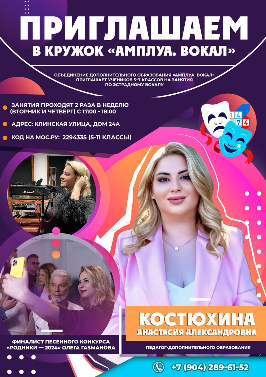 👨🎤 Театр "Амплуа" приглашает на занятия по актерскому вокалу! Ждём ребят 5-11 классов на нашем новом эксклюзивном направлении. Актёрский вокал это: ➡️ Развитие вокальных способностей, овладение техникой пения, дыхания, дикции ➡️ Формирование музыкального слуха и чувства ритма ➡️ Подготовка к участию в театральных постановках, концертах и иных активностях как в школе, так и за ее пределами 🎶 Занятия проводит лауреат международных и региональных конкурсов по эстрадному вокалу, участник телевизионных конкурсов "Голос сердца" и "Крылья победы", участница проекта Олега Газманова "Родники" Анастасия Александровна Костюхина. Запись на портале mos.ru, код: 2294335 Чудесного настроения и до встречи на занятиях! 🤗 #ДОНМ #ДопОбразование #Школа1474 #Амплуа1474