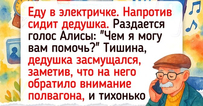 В электричке напротив сидит пожилой дедушка. Вдруг раздается голос Алисы: «Чем я могу вам помочь?» Дедушка краснеет, чувствуя взгляды соседей, и тихо говорит своему телефону: «Спасибо, я постараюсь сам». В этом моменте — целая философия: старое поколение и цифровой мир встретились, и между ними возникло странное, но тёплое уважение.