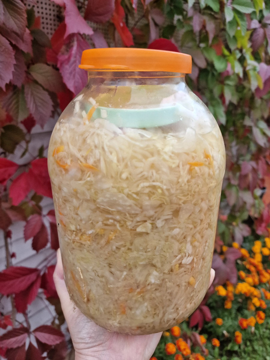 *Чтобы капуста не стала мягкой плотно её утрамбовываем (не допускаем попадание кислорода в продукт).
