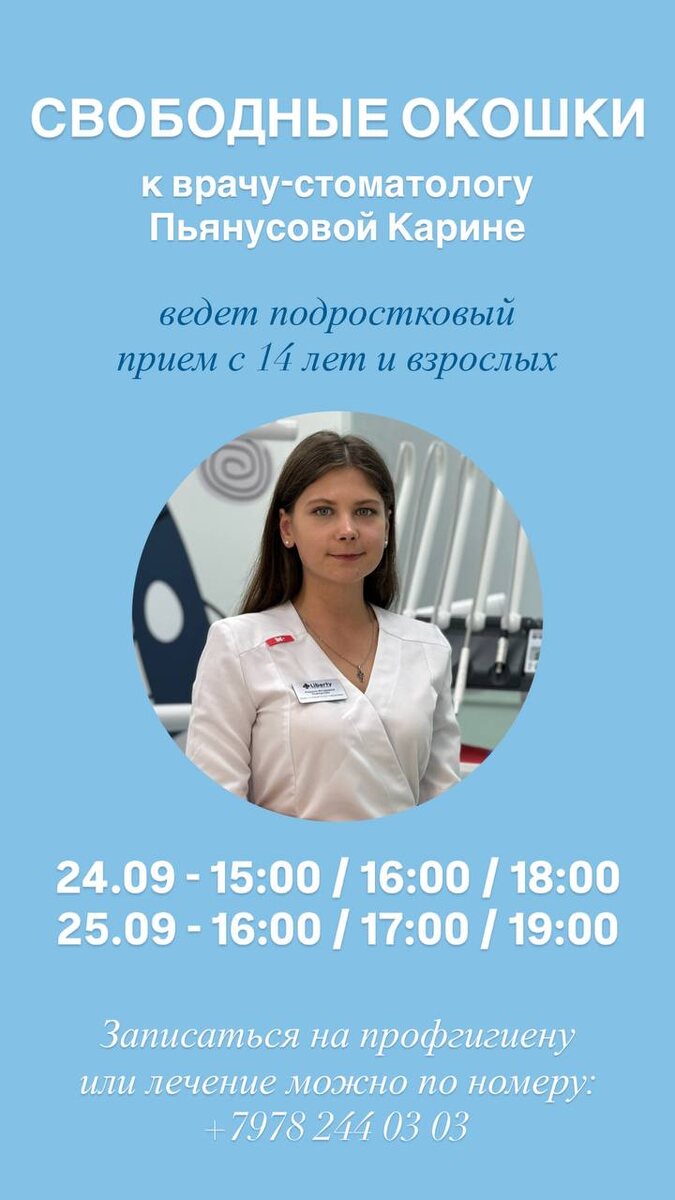 Свободные окошки к врачу-стоматологу Пьянусовой Карине 🩵