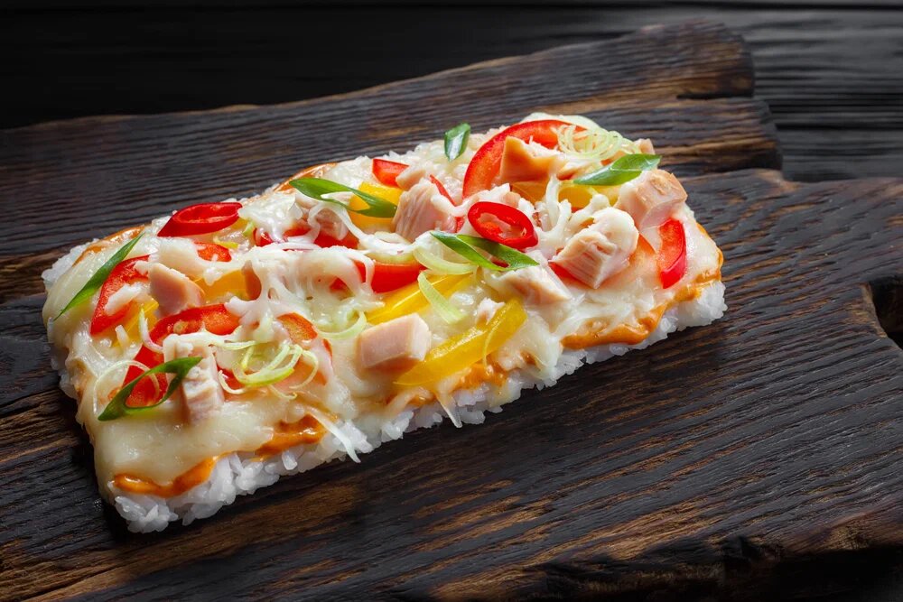Суши-пицца — это блюдо, в котором форма пиццы служит основой для классических суши-ингредиентов. Точное место рождения этого гибрида неизвестно, но его популярность взорвалась в североамериканских и европейских ресторанах, предлагающих азиатский фьюжн. Это блюдо-хитрость, созданное для поколения, которое обожает делиться фотографиями необычной еды.