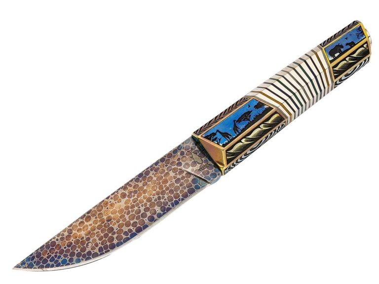 А теперь сделаем глубокий вдох. Деннис Фридли, член Гильдии Ножевых Мастеров, создал не нож, а предмет современного искусства. 23 см дамаска от Майка Норриса с полой шлифовкой, рукоять из «мрамора Пикассо» и… золотая инкрустация от Рэя Ковера-младшего. Этот кинжал стоит как неплохой мотоцикл. Он абсолютно бесполезен в быту и абсолютно прекрасен в своем существовании. Его можно вешать на стену в кабинете и медитировать на него. Это высшая форма признания того, что нож может быть чистой эстетикой.