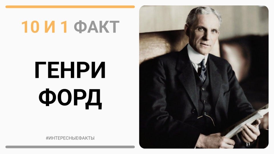 🚗 10 и 1 факт о Генри Форде 1. Генри Форд основал свою автомобильную компанию в 1903 году, что положило начало массовому производству автомобилей. 2. В 1913 году он внедрил конвейерное производство, что значительно сократило время сборки автомобилей и снизило их стоимость. 3. Его самая известная модель, Ford Model T, была представлена в 1908 году и стала первым доступным автомобилем для широкой публики с продажей более 15 миллионов единиц до 1927 года. 4. Форд увеличил минимальную заработную плату своих рабочих до $5 в день в 1914 году, что способствовало росту уровня жизни рабочих и потребительского спроса. 5. Будучи талантливым механиком, он собрал с нуля наручные часы, которые подарил жене. 6. Всего за свою жизнь Форд запатентовал 161 изобретение. 7. Он также занимался авиастроением и основал Ford Airplane Company во время Первой мировой войны. 8. Генри Форд был вегетарианцем. 9. Среди других его изобретений — угольные брикеты для шашлыков и барбекю. 10. Его состояние (вк