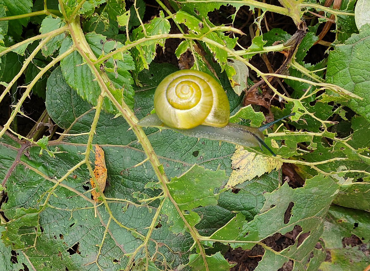 Садовые улитки (Cepaea hortensis) — привычные жители огородов, но иногда среди привычных буро-серых панцирей можно заметить настоящую «жемчужину» — улитку, чей панцирь сияет ярким, почти канареечным желтым цветом. Она кажется нездешней, случайной гостьей из тропиков. Первая мысль: «Что это? Мутация? Последствие химикатов?».