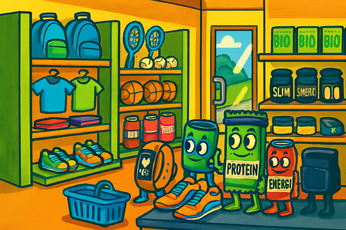 Ведущий: Здоровье. Сегодня мы не в студии, а прямо в спортивном магазине. Полки ломятся от ярких товаров, каждый обещает: «Возьми меня, я сделаю тебя сильнее, стройнее и счастливее!» Но мы знаем, что не всё золото, что блестит. 🎭 Сцена 1. У входа Здоровье заходит в магазин, берёт корзину. Сразу подбегает бутылка для воды: — Эй! Я нужна каждый день. Помогаю поддерживать баланс жидкости, улучшаю тренировки, снижаю риск обезвоживания. Я твой must-have! Здоровье кивает: — ✅ Берем.Водички-это святое! 🎭 Сцена 2. Полка с хитами К Здоровью подскакивают два конкурента: Здоровье хмыкает: — Браслет полезен, если ты реально используешь данные для привычек. — ❌ Вибропояс? Извини, но жир сам по себе не «сотрясётся». Наука говорит: без диеты и активности эффекта не будет. 🎭 Сцена 3. В отделе питания — Я — протеиновый батончик, удобный перекус после тренировки. — А я — энергетик, обещаю заряд бодрости. Здоровье: — Батончик может быть полезным, если смотреть на состав (меньше сахара