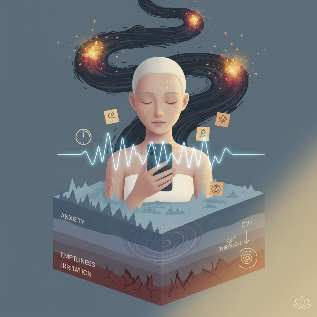 Вот была у меня такая история: утро, кофе, “пять минут” новостей — и вдруг полчаса пропало, а в теле гул и легкая тревога, будто сделал важное, хотя ничего не сделал. Позже узнал слово “думскроллинг” — привычка залипать в негативные потоки; у нее есть понятные маркеры: больше тревоги, ниже удовлетворенность жизнью, и посредником часто становится психологический дистресс.