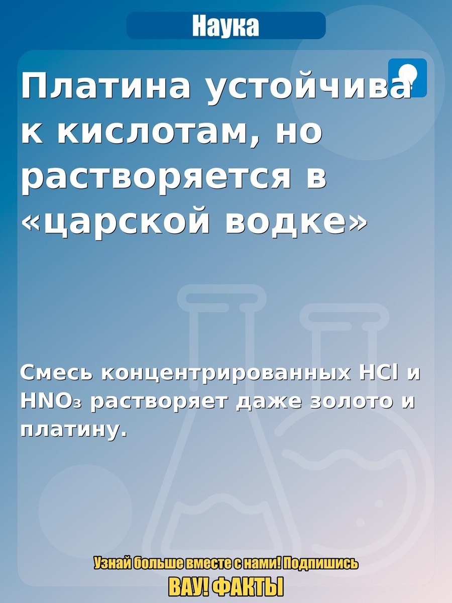 Платина устойчива к кислотам, но растворяется в «царской водке». Смесь концентрированных HCl и HNO₃ растворяет даже золото и платину. Интересный факт по теме «Наука»: Платина устойчива к кислотам, но растворяется в «царской водке». Почему так: Смесь концентрированных HCl и HNO₃ растворяет даже золото и платину.. Поделитесь в комментариях, знали ли вы об этом и стоит ли делать продолжение по теме. #наука #факты #интересно