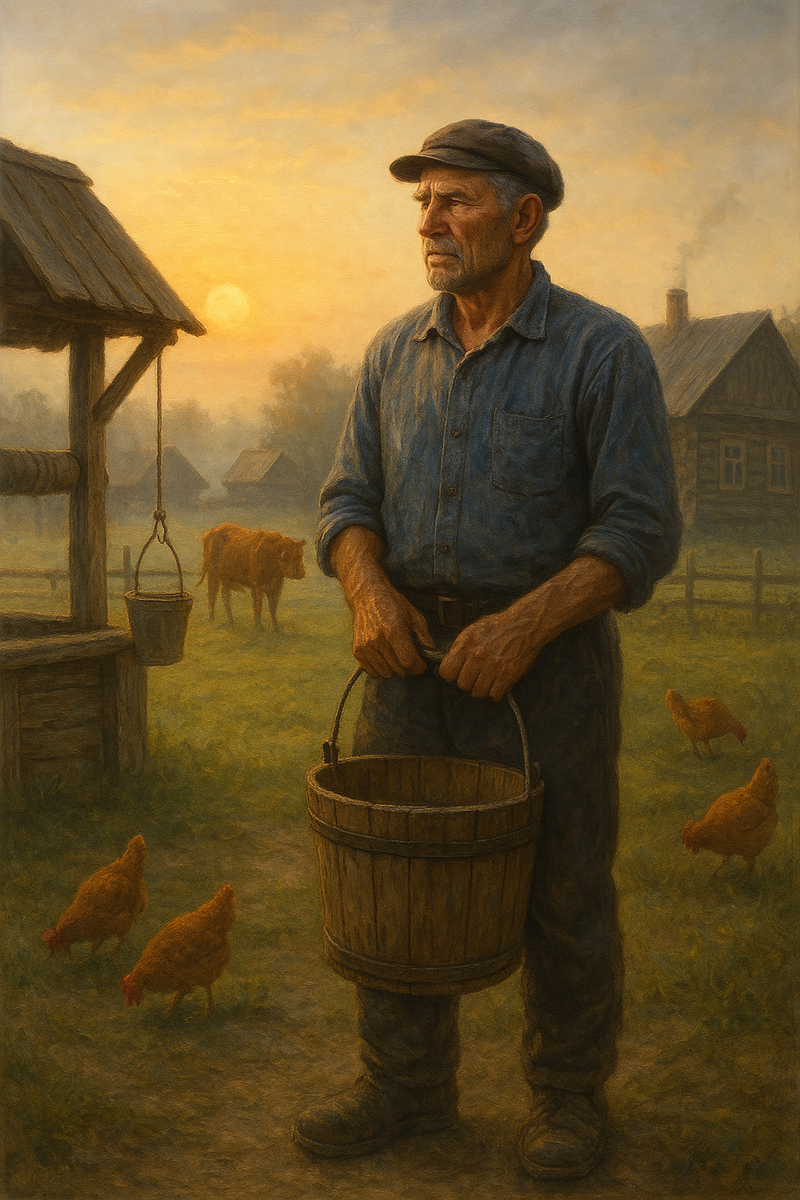 Он натянул сапоги, взял ведро и пошёл к колодцу. Ручка скрипнула, вода зашумела, поднимаясь на свет. Василий с наслаждением умылся холодной водой — как будто смыл сон и усталость. Жена его, Мария, уже возилась на кухне, ставила на стол картошку и хлеб. В семье детей было трое: старший сын Пётр работал в райцентре, средняя дочь училась в техникуме, а младший, восьмилетний Колька, пока что бегал босиком по двору, гоняя цыплят.