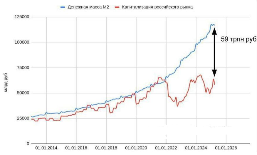 Рублевая денежная масса (М2), то есть наличные деньги в обращении и безналичные, включая депозиты, за период 2015–2025 годов увеличилась с 31 трлн до 118 трлн рублей, то есть в 3,8 раза. Исторически рост денежной массы всегда способствовал росту индекса Мосбиржи, но в последние годы заметно сильное расхождение в связи с геополитическими причинами и высокой ключевой ставкой ЦБ. У рынка акций накапливается потенциал роста. А нам остается формировать инвестиционный портфель из разных инструментов: акций, облигаций рублевых и замещающих, фондов денежного рынка, фондов коммерческой недвижимости и золота. «Вся человеческая мудрость заключена в двух словах: ждать и надеяться!» Александр Дюма «Граф Монте-Кристо». 💡 Подпишитесь на мой Telegram-канал: t.me/capitalist_00 — разбор акций, инвестиционные идеи и личный опыт. Только практика, без воды! Если вы хотите обсудить со мной ваши инвестиции, то запишитесь на наш созвон: https://dzen.ru/b/aITbOxV0I29gEV0p