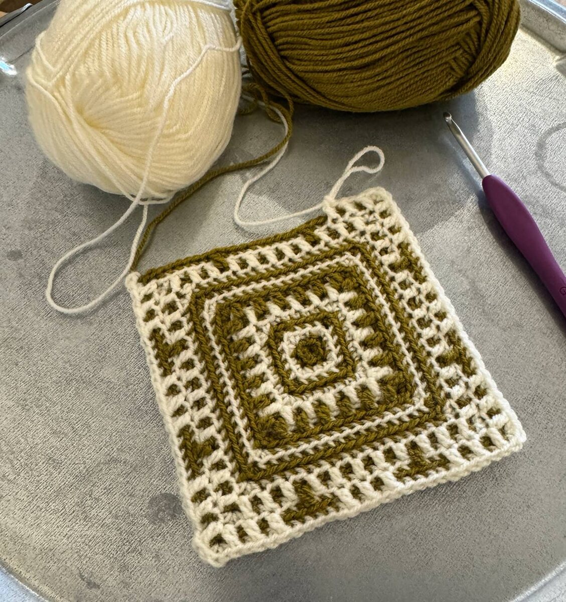 Про поворот центрального элеманта в квадрате Удобный случай поговорить про центровое вязание и его особенности. Вязание из центра по кругу, особенно если в начальных рядах мало столбиков с накидом, часто и по естественным «вихревым» причинам приводит к постепенному вращению центрального элемента вокруг своей оси. Это особенно становится заметным, если мы вяжем расположенными по периметру узорами. Участники проекта «Бесконечная мозаичная плитка» как раз этим занимаются. Ну поворачивается элемент в центре, и пусть, казалось бы. Но иногда это прямо бросается в глаза, возникает укачивающий оптический эффект. Хочется все время поправить. С помощью ВТО, кстати, как правило, можно выправить. Но можно и изначально уменьшить или вовсе свести на нет этот эффект. Как? Чередуйте ряды с разным захватом нити: один цвет всегда провязывайте, захватывая нить сверху, а другой цвет — снизу. Так вы не дадите вихрю разойтись.