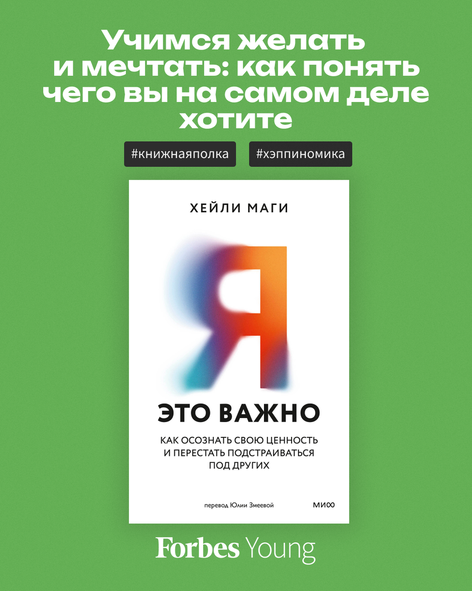 «Сколько себя помню, привычка угождать была моей второй натурой, воздухом, которым я дышала. Это получалось спонтанно, я даже не успевала понять, что происходит, и дать этому имя. Когда кому-то что-то от меня было нужно — родным, друзьям, бойфрендам, незнакомцам, — я просто соглашалась дать им это, невзирая на внутренний дискомфорт, усталость и недовольство», — признается сертифицированный коуч Хейли Пейдж Маги в своей книге «Я — это важно. Как осознать свою ценность и перестать подстраиваться под других», вышедшей в издательстве «МИФ». Отрывок из книги о том, как научиться понимать, чего вы хотите и о чем мечтаете, читайте на сайте Forbes #книжнаяполка #хэппиномика @forbes_young
