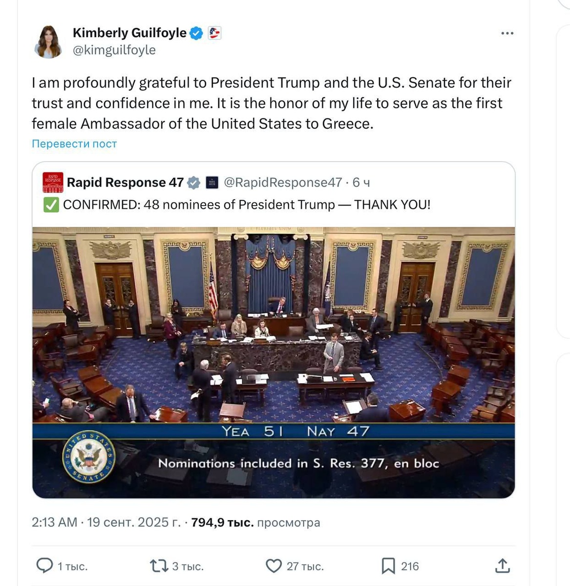 Сенат наконец утвердил Кимберли Гилфойл послом США в Греции. Не прошло и года ...