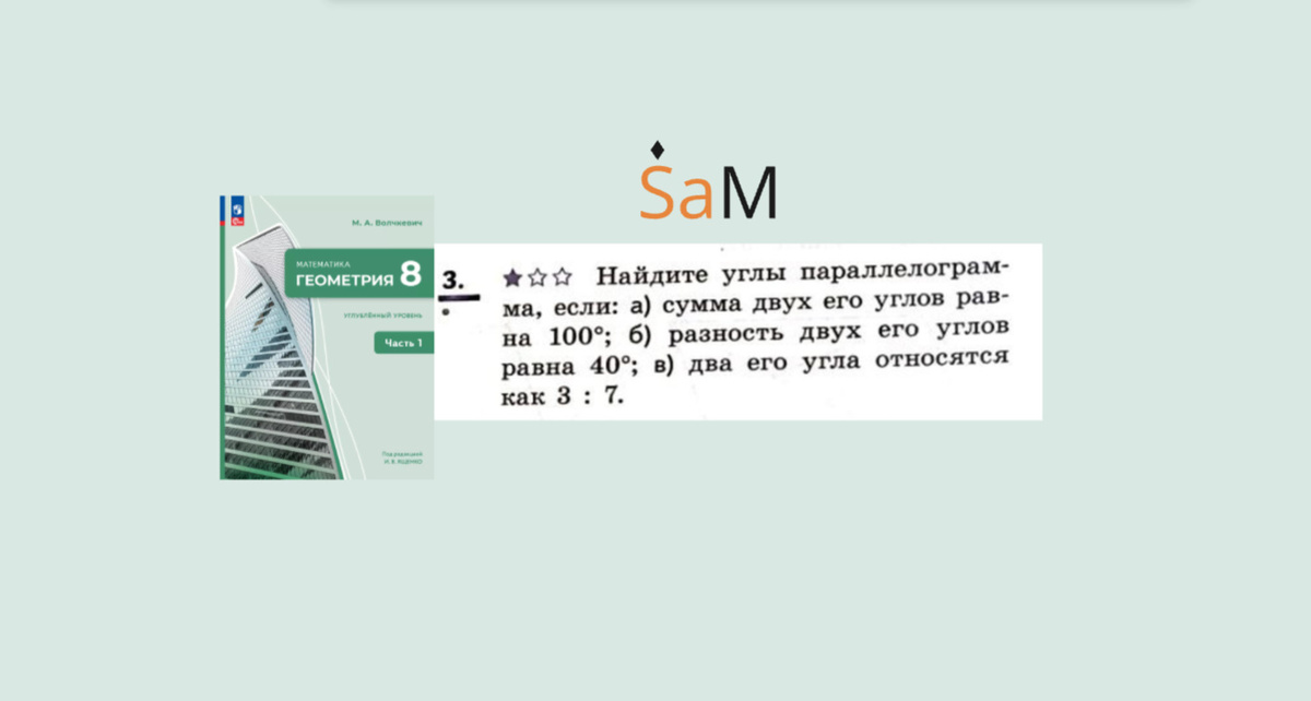 Мои каналы Дзен Vkвидео Телеграм RUTUBE You Tube Там можно также посмотреть задания в письменной форме и видео Обратите внимание, что на ютуб выкладывается только часть видео, не весь контент! 8 КЛАСС. ВОЛЧКЕВИЧ. УГЛУБЛЕННЫЙ УРОВЕНЬ. ГЕОМЕТРИЯ В 2 ЧАСТЯХ 3. Найдите углы параллелограмма, если: а) сумма двух его углов равна 100; б) разность двух его углов равна 40; в) два его угла относятся как 3:7 Для дальнейшего развития канала и публикаций бесплатного контента ставьте лайк, в топ, палец вверх и подписывайтесь ❤️ #sam #параллелограмм #волчкевич #8класс #учебник #гдз
