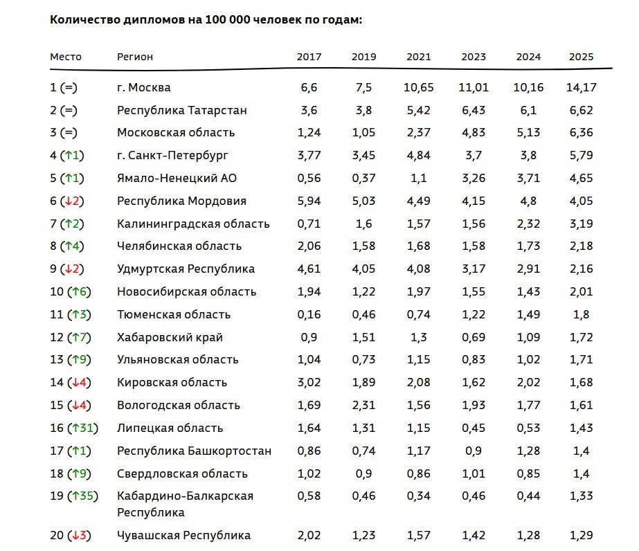 Рейтинг регионов по итогам Всероссийской олимпиады 2025 года Подведены итоги заключительного этапа Всероссийской олимпиады школьников 2024/25 учебного года. Финал проходил с 15 марта по 30 апреля по 24 предметам. По его результатам дипломы победителя получили 674 школьника, 3343 ученика стали призерами. Эти ребята смогут воспользоваться льготами при поступлении в ведущие российские вузы. Рейтинг, который сделала Олимпиада.ру, составлен по количеству дипломов на 100 тысяч человек. Он показывает эффективность работы по развитию талантов школьников в каждом субъекте, так как при подобном подсчете невозможно достичь высоких позиций только за счет размера региона. Мы также приводим данные за прошлые года, чтобы показать динамику в результатах того или иного региона. Первенство в тройке лидеров сохраняют Москва, Московская область и Республика Татарстан. Санкт-Петербург и Ямало-Ненецкий Автономный округ улучшили свои позиции, поднявшись на одну строку в рейтинге. За ними следуют Республик