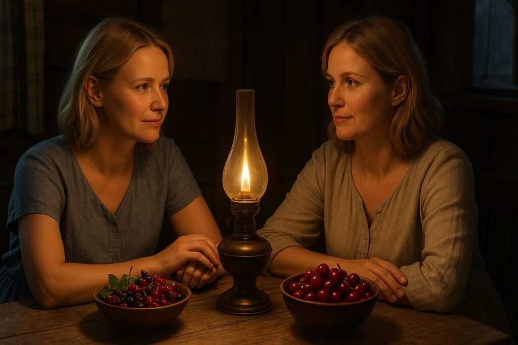 По давно устоявшейся традиции сёстры устроили себе спальные места на летней кухне, где на большом столе были рассыпаны собранные днём ягоды смородины и вишни.