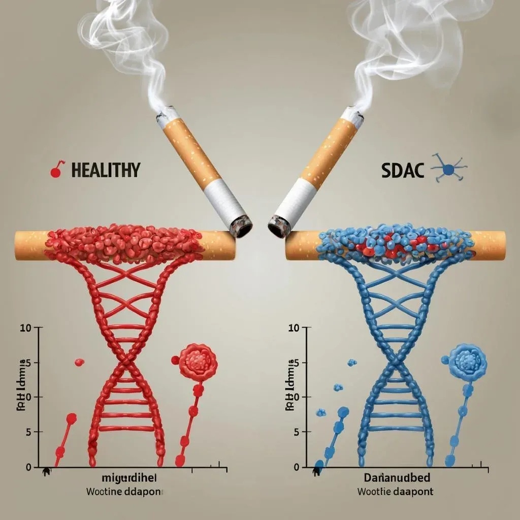Тем временем далеко отсюда, в просторном лабораторном помещении другого района города, известный врач-исследователь Елена Петровна склонилась над мощным электронным микроскопом, тщательно изучая образец тканей пациента, добровольно участвующего в научном проекте по изучению влияния современных устройств для курения на человеческий организм. Изображение под объективом аппарата выглядело тревожно: волокна ДНК подверглись множественным разрушениям и нарушениям структуры. Каждая хромосома напоминала тончайшую нить, повреждённую в нескольких местах. Трещины и разрывы свидетельствовали о глубоком воздействии чего-то очень сильного и агрессивного.