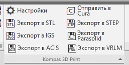 Сделал новую версию плагина Компас 3D для автоматического экспорта моделей для последующией 3D печати. О том, что это такое, можно прочитать в предыдущих статьях (1я часть, 2я часть), а сейчас о нововведениях. Во-первых, плагин теперь предоставляет кнопки на панели инструментов для быстрого ручного экспорта в STL, STEP, IGES, VRLM, ACIS, Parasolid. Можно добавить панель целиком, а можно отдельные кнопки на Панель инструментов. Например, я добавил в системную панель только 2, нужные мне кнопки: "Отправить в Cura" и "Экспорт в STL". Не нужно каждый раз выбирать настройки сохранения, изменить и сохранить их можно в меню "Приложения->Kompas 3D Print->Настройки". Там же указывается путь к слайсеру, в котором можно открыть модель для печати. Вы уже заметили кнопку "Отправить в Cura". Да, наверное это то, чего давно не хватало в Компасе! С помощью неё можно сразу открыть слайсер с моделью для печати. Текущая деталь фоном экспортируется во временную директорию и открывается сразу в Ultimaker C