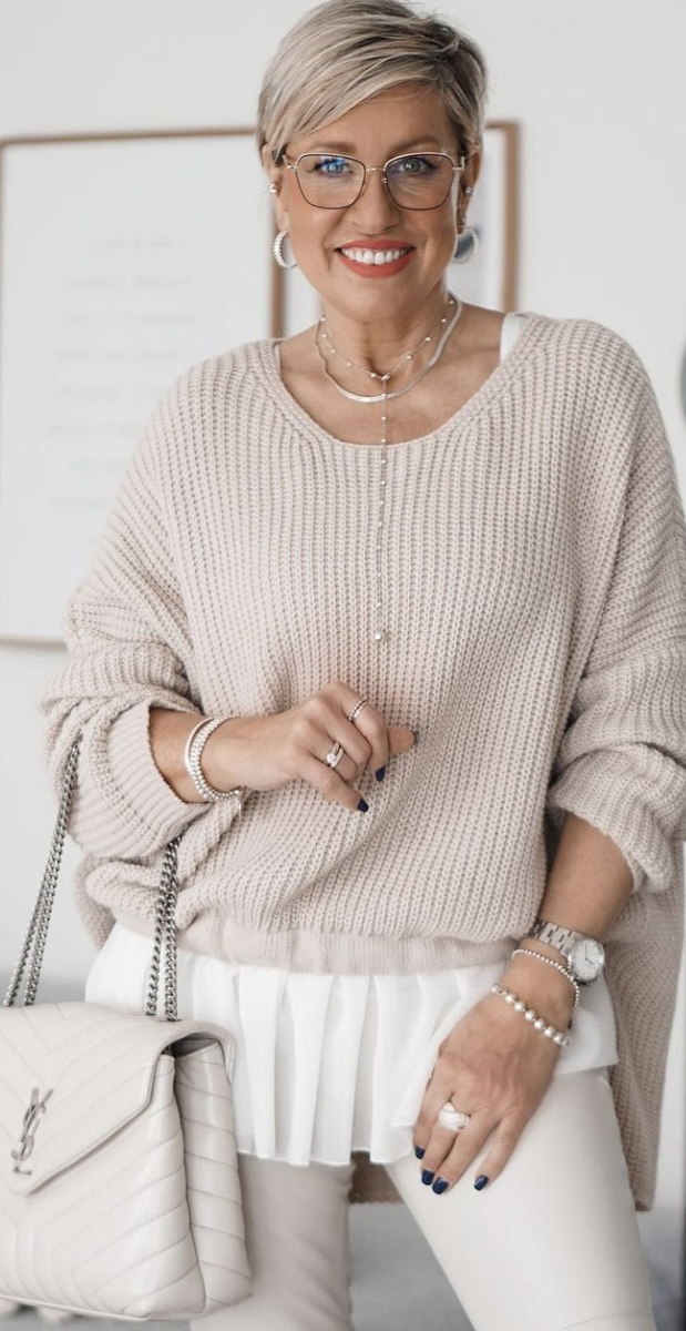 Осенью 2025 года возрастные дамы совершенно не ограничены в выборе стильной вязаной одежды, если они помнят об одном простом правиле: подобные вещи должны подходить по возрасту и хорошо сидеть на фигуре, гармонично сочетаясь с другой одеждой в отдельно взятом образе. В списке самых распространенных вязаных вещей, которые могут позволить себе дамы возраста 50+, находятся в первую очередь свитера, кардиганы и платья. 1. В осеннем сезоне 2025 года для возрастных женщин рекомендованы свитера нейтральных цветов: серые, кремовые, темно-синие, хотя эксперименты с более яркими и насыщенными оттенками тоже допустимы. Интересными для зрелых дам моделями будут свитера с оригинальными деталями – косой вязкой, образующей узоры, или с особой ребристой текстурой. Грамотно подобранные вещи можно интересно объединять с различной одеждой для образов в разных стилях: с джинсами и кроссовками или ботинками для casual, со строгими брюками для сдержанного рабочего дресс-кода, с юбкой-карандаш для эффектного