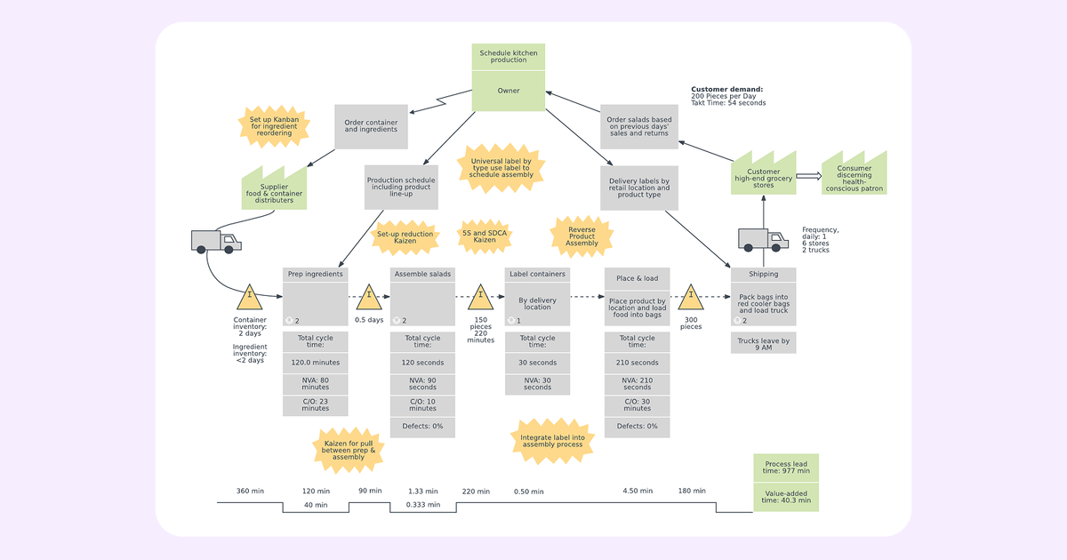 VSM – это именно такая схема, только более детальная и структурированная. Она показывает весь путь материала (или информации) через все процессы, включая время ожидания, количество людей, объемы запасов, время цикла каждой операции. По сути, это рентген вашего производственного процесса, который показывает не только кости, но и все проблемные места.