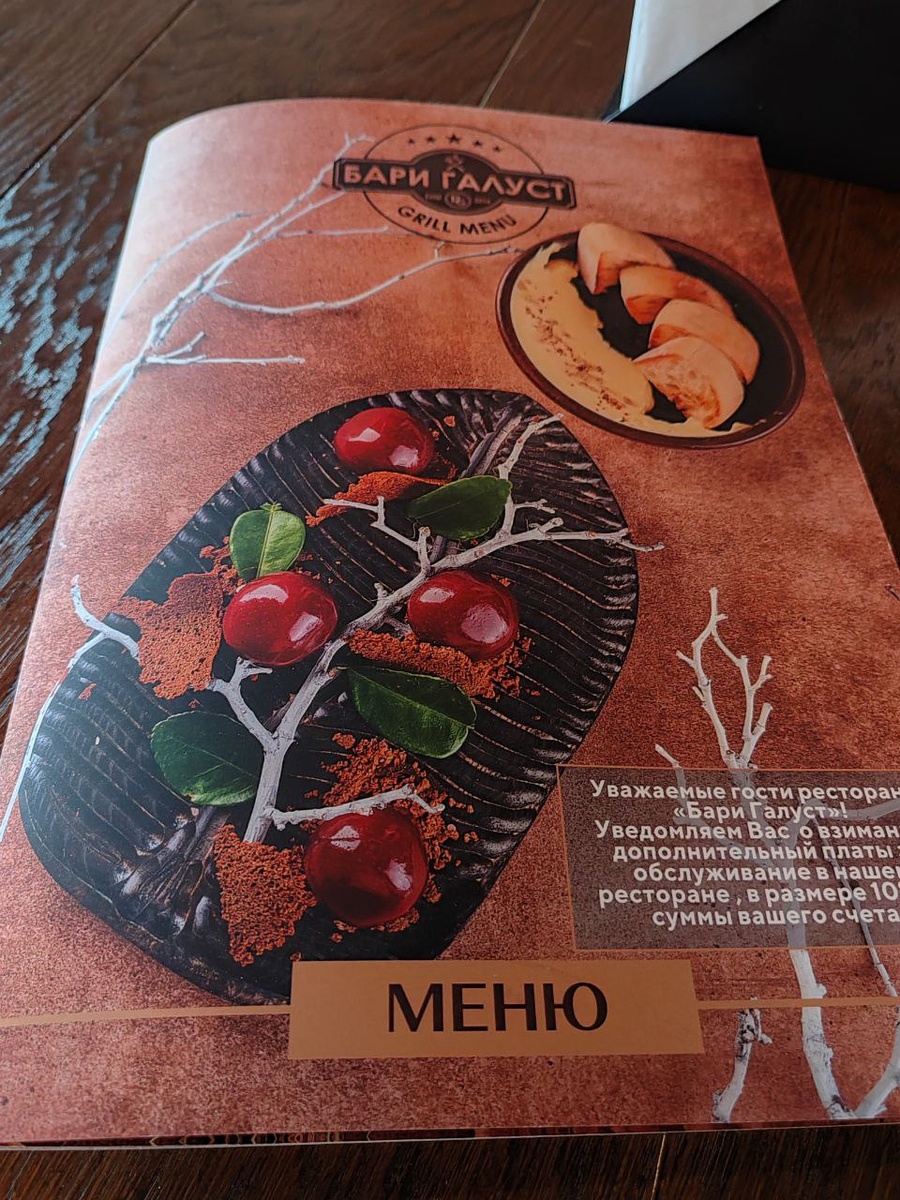 Зашли покушать в ресторан Бари Галуст Взяли: Салат из баклажанов жареных Крем суп из тыквы с сырным мусом Грибная похлёбка со сметаной и хлебушек с зеленью Цыпленок в соусе дзадзыки под кунжутом и зернами гранами Чай с грушей и манго