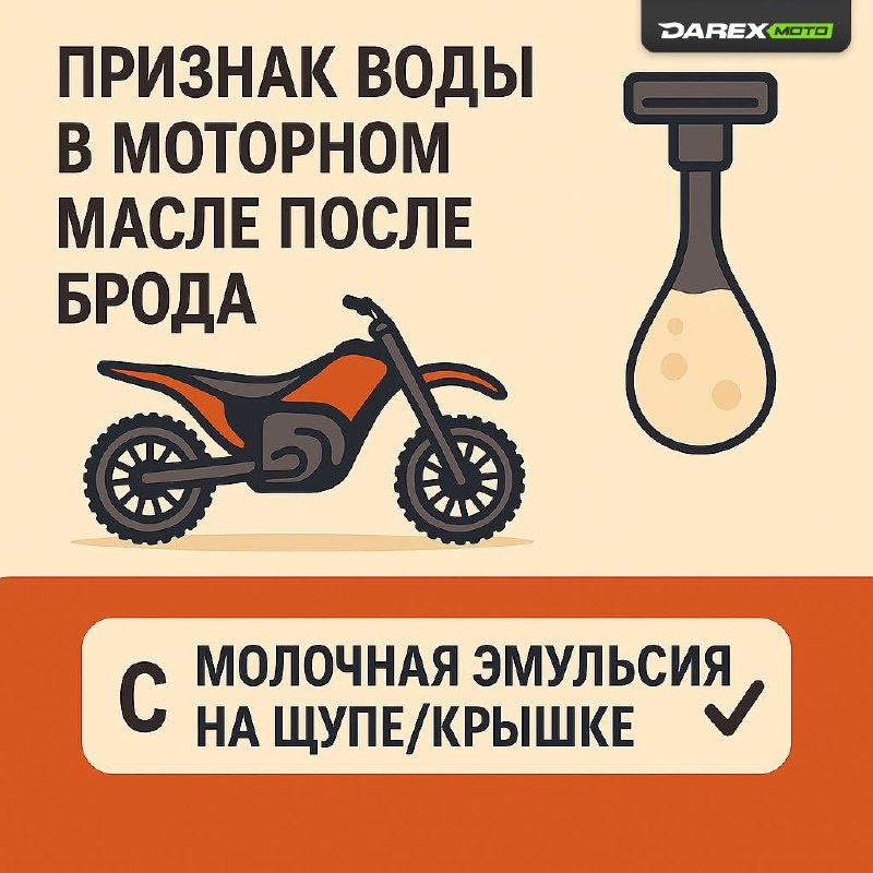 Признак воды в моторном масле после брода: A) Масло чёрное и густое В) Запах бензина C) Молочная эмульсия на щупе/крышке ✅ Почему так: вода взбивается с маслом и даёт «молочный кофе» — пену/эмульсию на щупе, крышке и в смотровом окошке. Часто ещё растёт уровень «масла». Что делать срочно: 1️⃣Не заводи. Слей масло. 2️⃣Поменяй фильтр, залей недорогое масло, прокрути/прогрей коротко и снова слей (2–3 промывки, пока цвет не станет нормальным). 🔆Просуши фильтр нулёвик/бокс, проверь сапун картера и разъёмы. 4️⃣На 2Т проверь коробочное масло отдельно — оно тоже может стать «молоком». Профилактика: подними сапуны, диэлектрик в фишки, не штурмуй брод «с ходу», держи ровный газ. Было полезно? Напиши да/нет 🏁