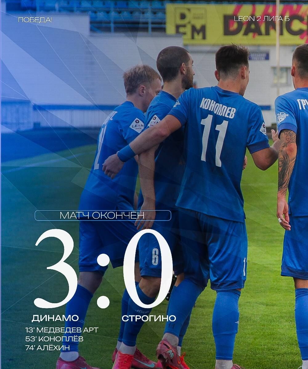 Завершился матч в рамках Второй лиги Дивизиона Б между футбольными клубами «Динамо» (Брянск) и «Строгино» (Москва). Встреча завершилась уверенной победой брянской команды со счётом 3:0. Уже на 13-й минуте матча Медведев открыл счёт, а на 53-й минуте Коноплёв удвоил преимущество хозяев. На 74-й минуте Алехин установил окончательный результат, забив третий мяч в ворота московского клуба. По итогам встречи «Динамо» укрепилось на первом месте в турнирной таблице, в то время как «Строгино» остаётся на 14-й позиции. Следующую игру брянский коллектив проведёт 27 сентября против клуба «Квант», начало матча запланировано на 14:00 по московскому времени. 0+