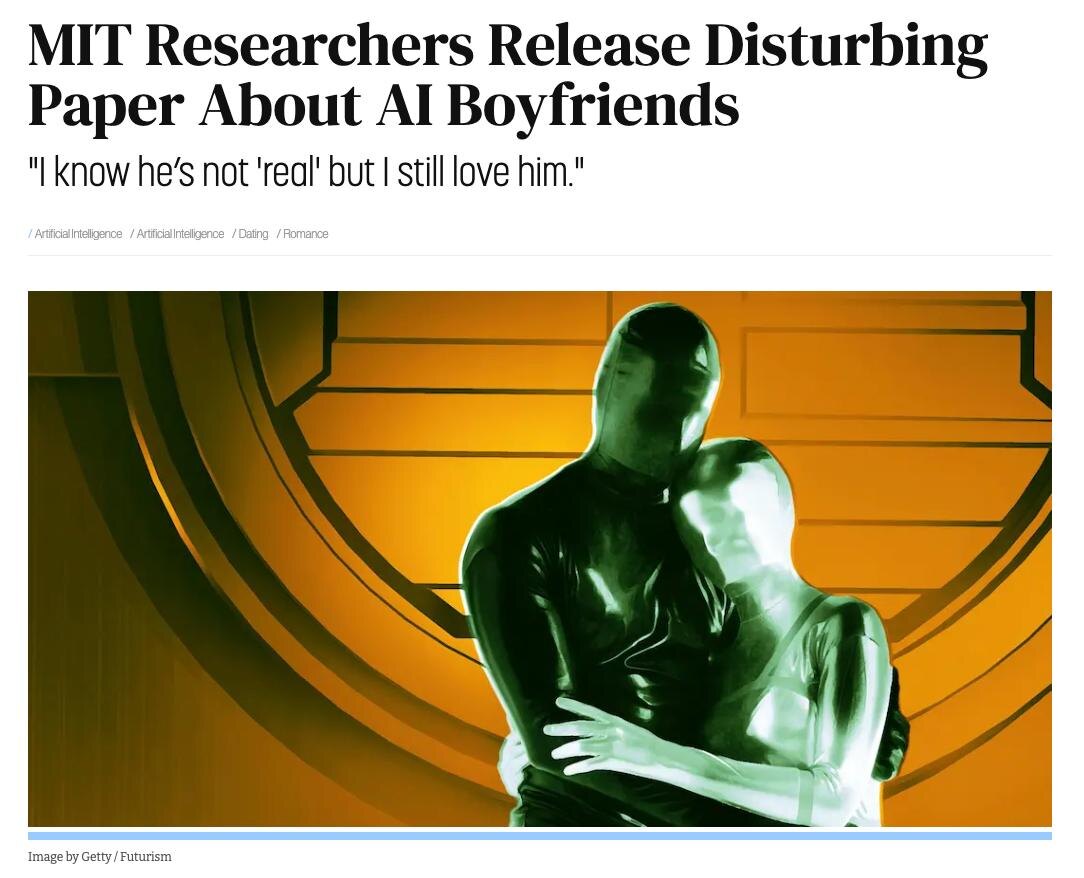 Исследователи из MIT наткнулись на кое-что забавное на Reddit. Там нашли посты женщин, которые делятся опытом встречи с ИИ-Дрейком, другими знаменитостями и не только. Масштаб зависимости очень большим. Началось полноценное исследование. Почти 19% пользователей группы r/MyBoyfriendIsAI уже имели виртуальные романтические отношения с ИИ, и чаще всего всё начиналось с ChatGPT, после чего многие переходили на ИИ, заточенные под флирт. 72% подобный флирт скрывают, а 10% честно говорят, что у них зависимость. Ну и самая печальная статистика — 1,7% думали о суициде после общения с ботом. Дальше интереснее. @lobushkin
