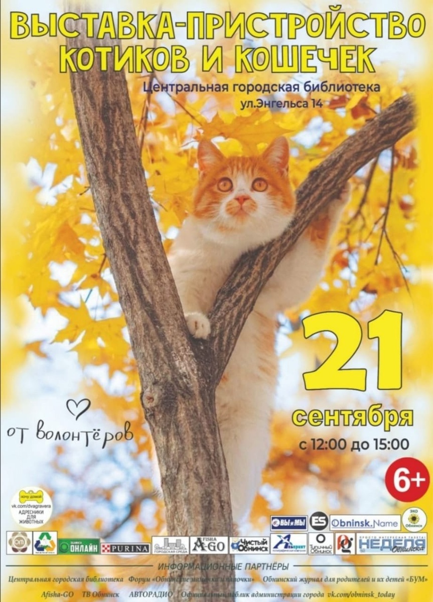🐱21 сентября с 12:00 до 15:00 в Центральной библиотеке в Обнинске пройдёт выставка-пристройство кошек и котят от волонтёров