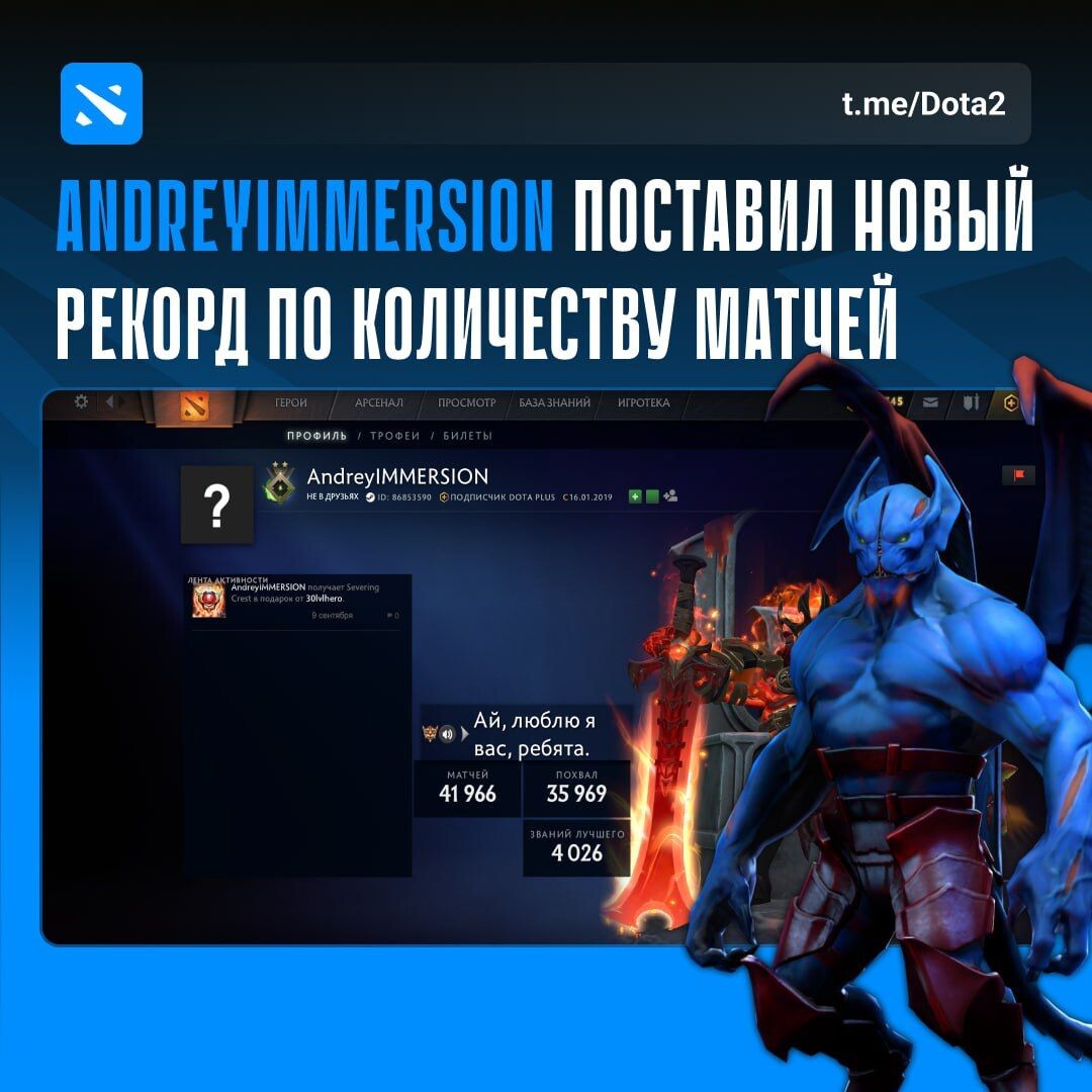 В мире Dota 2 установлен новый рекорд по количеству сыгранных матчей. Игрок с ником AndreyIMMERSION стал первым в мире, кто смог сыграть почти 42 000 матчей. 🎉 За 11 лет упорных игр AndreyIMMERSION достиг ранга Рекрут 2, что примерно соответствует 500 MMR. Это впечатляющее достижение, демонстрирующее его преданность игре и настойчивость. Среди любимых героев AndreyIMMERSION: — Night Stalker с 4 835 сыгранными матчами — Wraith King с 3 663 сыгранными матчами — Sniper с 2 074 сыгранными матчами Этот рекорд действительно впечатляет и показывает, насколько глубокой и увлекательной может быть игра в Dota 2. 🏆 🔗 Больше новостей смотрите на News.Mentup