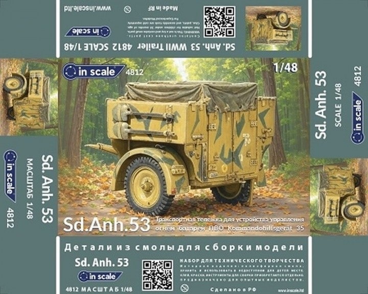 In Scale из Москвы выпускает из полиуретановой смолы модель немецкого прицепа Sd.Anh.53 для транспортировки устройства управления батареей ПВО в масштабе 1/48: Sd.Anh.53 (каталожный номер 4812)