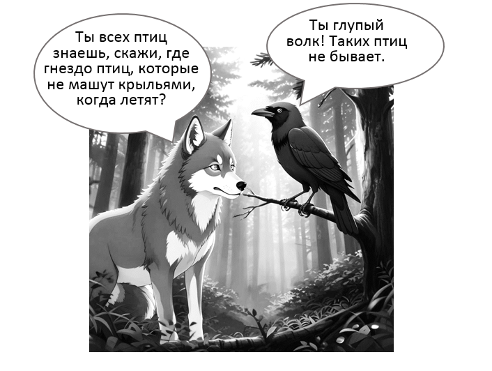 Прошло время. Из маленького щенка Волька превратился в большого красивого, сильного волка. Наступило лето, и он подумал, что сейчас как раз хорошее время, чтобы отправиться на поиски гнезда странных птиц. Все главы по этой ссылке! Но сначала он решил порасспросить лесных обитателей. Лиса показала Вольке дорогу в деревню, но предупредила, что там эти птицы часто бывают очень страшные, большие и очень громко гудят. Волька поблагодарил её и побежал. Знакомый лес закончился, начался чужой… Но он был не такой густой, поэтому бежать было легче. И вдруг Волька услышал топот множества сильных ног и почувствовал незнакомый запах! Кто это? Он быстро нырнул в кусты и затаился. Топот, запах и незнакомые звуки быстро приближались… Волька дождался, когда звери, собаки и люди пройдут мимо, и изменил свой маршрут, решив идти в обход деревни. Он успел пробежать совсем немного, как вдруг услышал знакомый гул, но только очень громкий! Волька развернулся и побежал в ту сторону, откуда вылетела птица. И вс