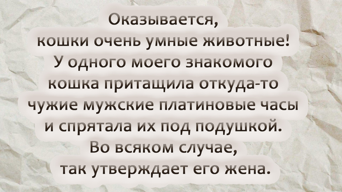 Улыбнуло! Кошки, конечно, умные животные, но чтобы платиновые часы таскать... Это сказка для мужа.