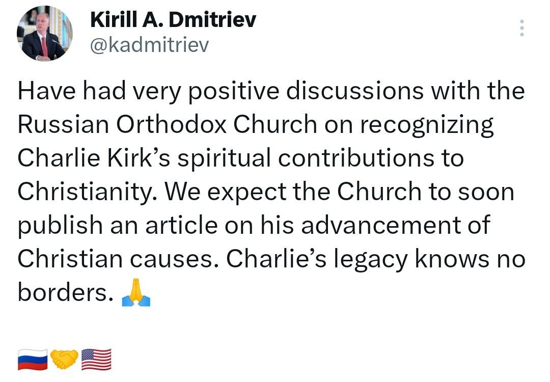 Russian Orthodox Church to RECOGNIZE Charlie Kirk's 'spiritual contribution to Christianity' Putin envoy Dmitriev: 'Charlie's legacy knows no borders' From Alaska to Charlie Kirk, Dmitriev's building bridges