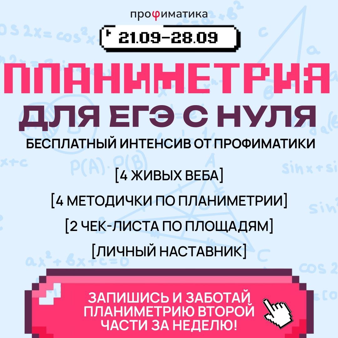 ❗️ИНТЕНСИВ ПО ПЛАНИМЕТРИИ❗️ 😵💫 №17 по планиметрии снова крадет твои баллы? Чертёж не сходится, построения теряются, а доказательства превращаются в кашу? 🕹 Тогда тебе нужен ИНТЕНСИВ ПО ПЛАНИМЕТРИИ! С 21 по 28 сентября прокачаешь №17 так, что на ЕГЭ заберёшь полный балл. 🎮 За неделю ты: — разберёшь ТОП-10 теорем, которые реально спасают на экзамене, — научишься тащить первую часть профиля без ошибок, — освоишь 3 ключевые конструкции для №17, — узнаешь «секреты успешной подготовки к ЕГЭ в 11 классе». ЗАПИСАТЬСЯ 💎 Лутай файлы прямо на интенсиве: ▪️ методичка по базовой теории, ▪️ «Планиметрия ФИПИ», ▪️ шпаргалки по площадям и окружностям, ▪️ «30 задач по планиметрии» и вся теория (по рефке, зови друзей). 👾 Не будь NPC — врывайся, слоты в пати ещё есть! 🛑🔤🅰️🔤🔤🔤🅰️🛑 🎁 Призы и бонусы для участников интенсива: — авторские методички, — полезные материалы, — розыгрыш 6 бесплатных мест в марафоне среди тех, кто выполнит все условия. 🌸☺️ Плюс наставники, которые всегда ряд