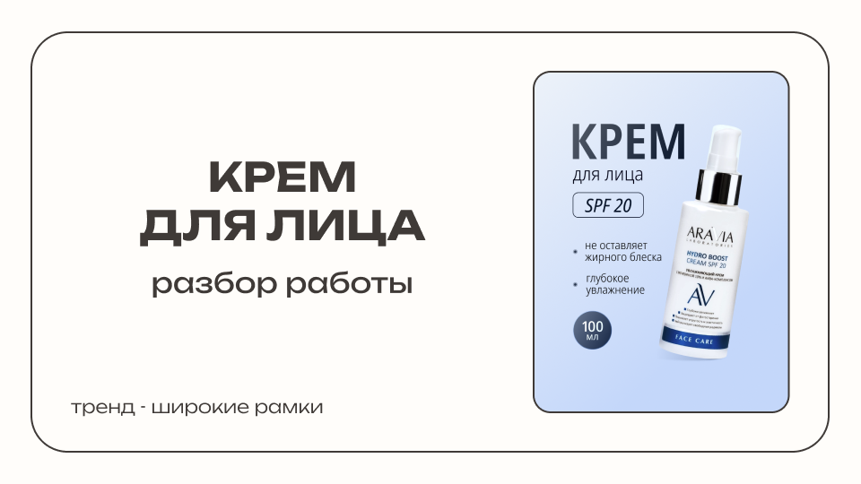 Это последняя работа, выполненная в тренде «широких рамок», поэтому ждите следующего интересного приёма в дизайне карточек. Это будет впечатляюще, по крайней мере я без ума. При анализе поисковой сетки я увидела, что большинство карточек выполнено в менее контрастных цветах, там больше нежного, светлого, поэтому, чтобы не казаться вороной среди этих карточек, я задействовала светло-голубой градиент. Мы помним, что в дизайне товар должен быть контрастным к фону, но в данном случае делать фон темным будет неправильно, так как мы не попадем ни в целевого покупателя, ни в поисковую сетку. Поэтому здесь будьте аккуратны. Товар по визуальному архетипу и по архетипу аргументации — чистый защитник. Поэтому здесь я задействовала синий оттенок, стандартные шрифты, ничего инфантильного и детского. Здесь должна быть некая строгость, говорящая о заботе и здоровье. В поисковой сетки выделяется данная карточка просто великолепно! Что было сделано: