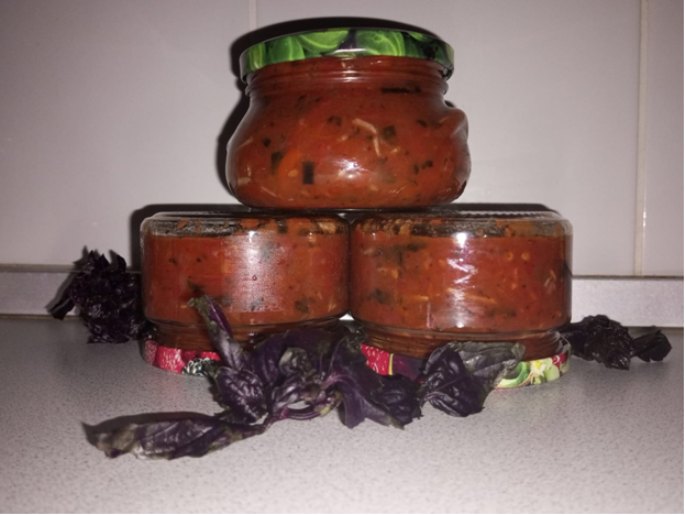 Оба рецепта очень нравятся моей семье, готовлю по партии каждый год, не могу выбрать кокой-то один. Оба соуса хороши к мясу, бутербродам или просто на хлеб. 1.Ингредингты: - помидоры – 2 кг.; - перец сладкий, болгарский, красный – 3 шт.; - лук репчатый – 2 средние шт.; - перец острый – 1 стручок; - перец черный молотый – 0,5 ч. ложки; - очищенный чеснок – 1 головка; - базилик фиолетовый – 2 пучка или 1 фиолетовый, 1 зеленый пучок; - масло растительное – примерно 50 мл.; - соль – 1 ст. ложка с небольшим бугром; - сахар – 4 ст. ложки с небольшим бугром или по вкусу; - уксус 70% – 1 ч. ложка. Базилик разобрать на стебли и листья. Листья мелко нарезать, а тонкие стебли пойдут в мясорубку, твердые не нужны. Помидоры, перец, лук, стебли базилика пропустить через мясорубку. В емкость для варки добавить растительное масло, пропущенную через мясорубку смесь, проварить, помешивая с момента закипания 20-25 минут. Добавить соль, сахар, мелко нарезанный базилик, измельченный чеснок, перец черный м