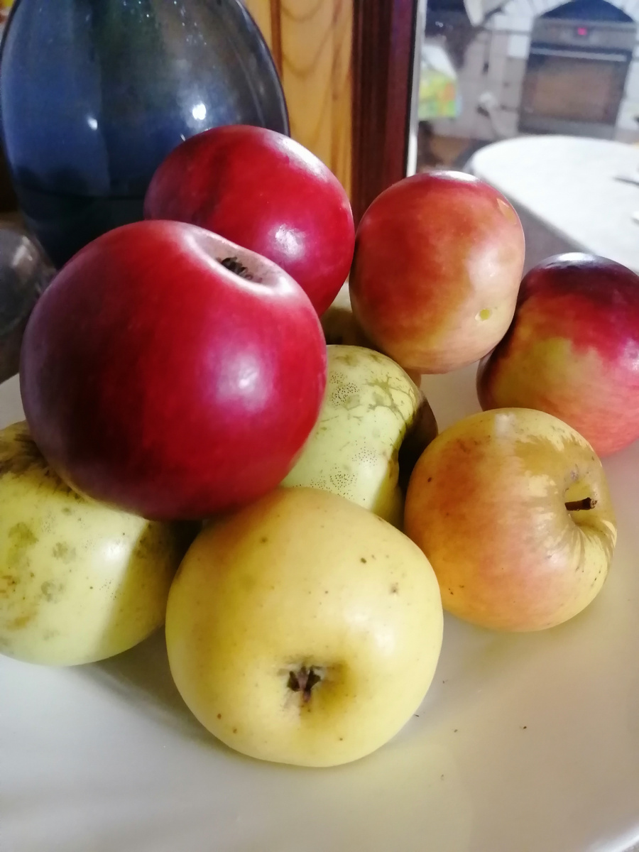 Полез мой бедолага опять на крышу. А я ещё кофе мелю, курицам отходы вынести надо, собака яблоко просит. Соседка ведро яблок передала, красных. Вкусные, не передать, какие вкусные. Они осенние, такие плотные, думаю, а может их тоже сделать мочеными.
