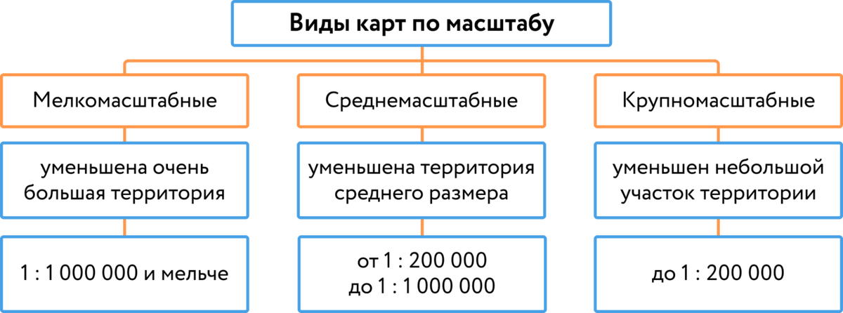 Один из самых распространённых видов геоизображений — географические карты. Географическая карта — это обобщённое изображение всей земной поверхности или её частей на плоскости, в масштабе, с помощью условных знаков. Географическая карта обязательно имеет масштаб, который показывает степень уменьшения изображаемой поверхности. Карта ориентирована по сторонам горизонта. Это позволяет определить, где находятся разные объекты относительно сторон горизонта и друг друга. Систематическое собрание географических карт называется атласом. Карты различаются по масштабу. Чем больше изображаемая территория, тем мельче масштаб. Карты, масштаб которых 1 : 1 000 000 (в 1 см 10 км) и мельче, называют мелкомасштабными. Обратите внимание: чем меньше масштаб, чем больше число в знаменателе, тем больше уменьшена изображаемая территория. Карты масштабом 1 : 200 000 (в 1 см 2 км) и крупнее называют крупномасштабными. Чем крупнее масштаб, тем подробнее изображена на нём территория. Обратите внимание: чем к