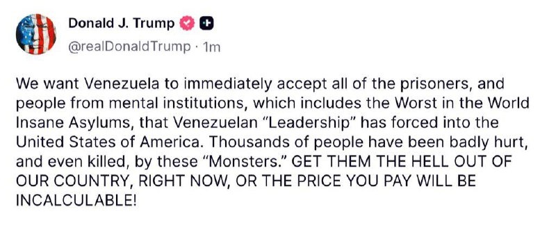 Trump issues FINAL warning to Venezuela ‘Accept prisoners and people from mental institutions’ ‘OR THE PRICE YOU PAY WILL BE INCALCULABLE’ What’s he planning?