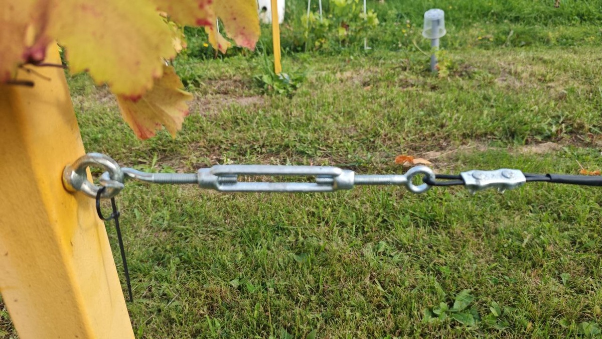 В кольцо талрепа вставляется шпалерный трос (у меня ПРШ 3,5 на всём винограднике), который крепится специальным двойным зажимом.