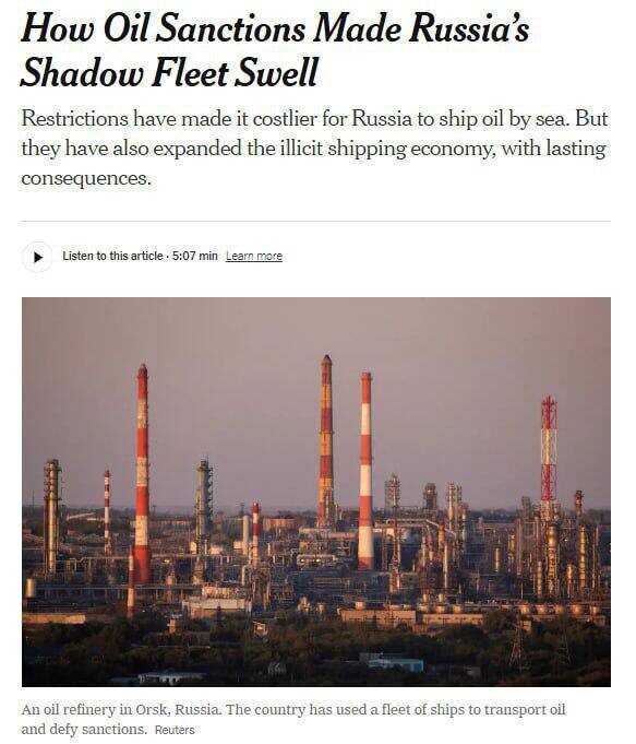 🔻 По данным издания, речь идёт о сотнях танкеров — старых, переоформленных, с частыми сменами флагов и фиктивными страховками. Они продолжают перевозить российскую нефть в обход потолка цен и санкций.