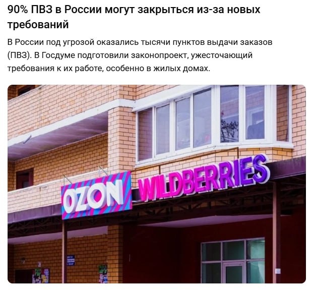 Этих арендаторов больше не будет🤯 Или будет ещё больше? Давайте разбираться Суть нового законопроекта, согласно внесённым поправкам: ПВЗ в жилых домах должны будут иметь отдельный вход с улицы, ограничить число поставок малотоннажным транспортом, хранить заказы не дольше 72 часов, отказаться от фасовки и переупаковки, а так же не загромождать помещения высокими стеллажами. По опыт скажут так: Бизнес будет перестраиваться и искать новые конфигурации. Планы по открытию точек, маркетплейсы врятли будут менять. Что будет меняться? — Стоимость аренды будет дороже — ПВЗ начнут искать объекты с новыми конфигурациями — Думаю, что станет больше объединений в рамках стратегии ЦВЗ, если годное помещение будет на 2-3-4 арендатора А что думаете вы, для кого эта новость позитивная? Для тех кто занимается субарендой — 👍 Для тех кто держит ПВЗ — 🔥 Для маркетплейсов — ❤️