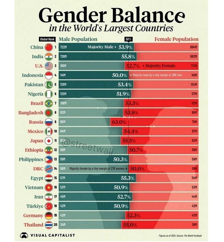 Но до определенного возраста у девушек больше шансов встретить свою половинку. То, что в России на 10 девчонок по статистике 9 ребят - известно давно. Но чтобы на 10 девчонок было всего лишь 5 ребят - эти данные статистики, возможно, будут для кого-то неожиданными. Количество проживающих в России женщин составляет 63% от общего числа населения, мужчин – 37%. Такие данные приводит издание Лента.ru со ссылкой на исследование аналитической компании Civixplorer на основе данных за 2024 год. Женское население преобладает в США, Мексике, Германии, Бразилии, Японии, Таиланде. Но в этих странах процентное соотношение женщин чуть больше 50% - где-то 52, где-то 55%. Однако, такого сильного перевеса в пользу (а точнее, совсем не в пользу) женщин, как в России, нет ни в одной стране из списка исследуемых аналитиками.