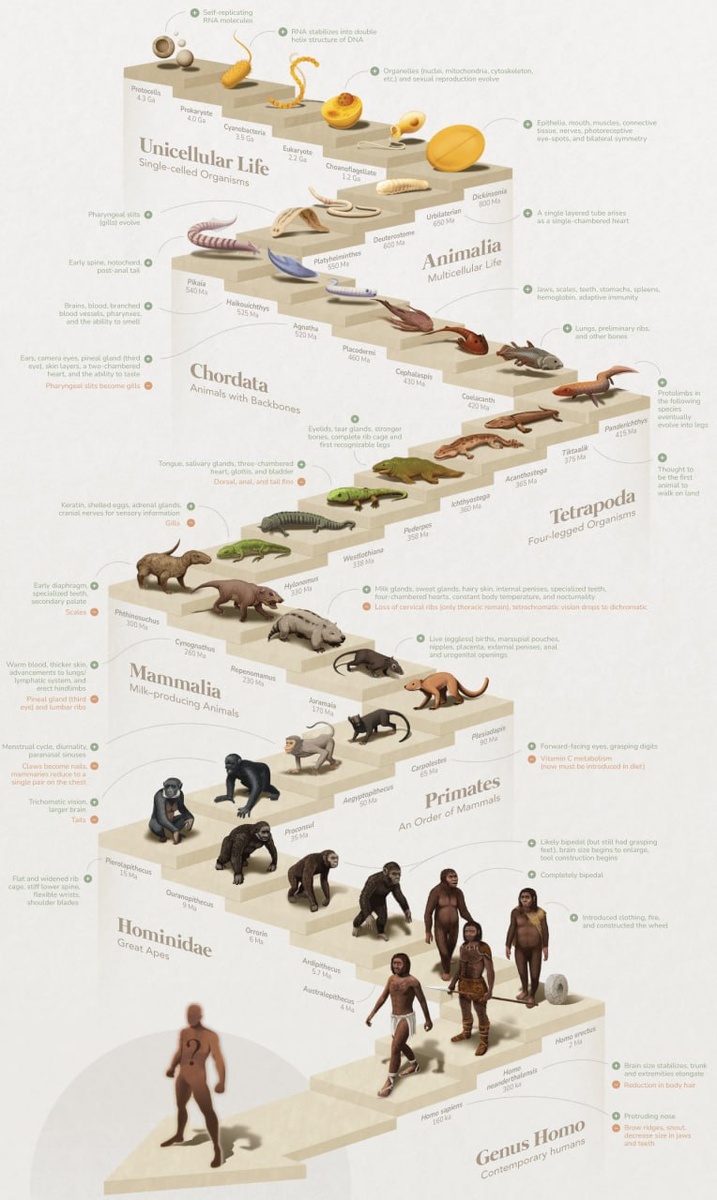 🦋На картинке – весь эволюционный путь, который прошли наши предки за 4 миллиарда лет. В этом сериале шесть сезонов: в первом мы были одноклеточными микроорганизмами, во втором – червями, в третьем – рыбами, в четвертом – пресмыкающимися (точнее, их четвероногими предками), в пятом – млекопитающими вроде землероек, в шестом – обезьянами. 🧐Сейчас идет седьмой сезон этого всепланетного шоу, но станет ли он финальным? Наш телеграмм канал 🎁😉 t.me/dumai_russia Наш ВК https://vk.com/dumai_russia