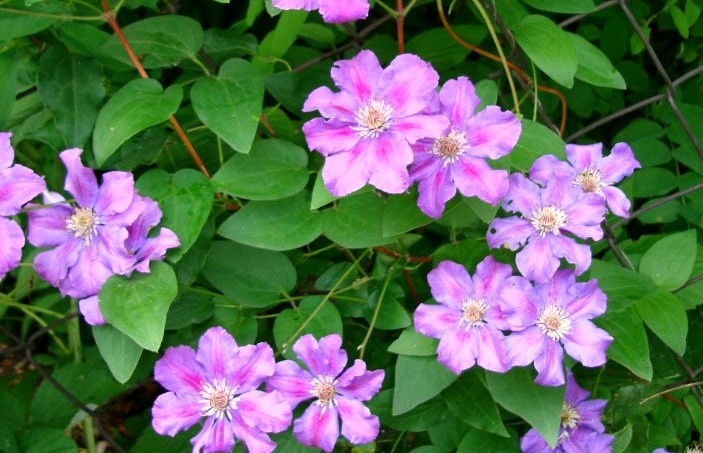 Это клематисы с ранним цветением (май–июнь). Побеги сохраняют полностью.