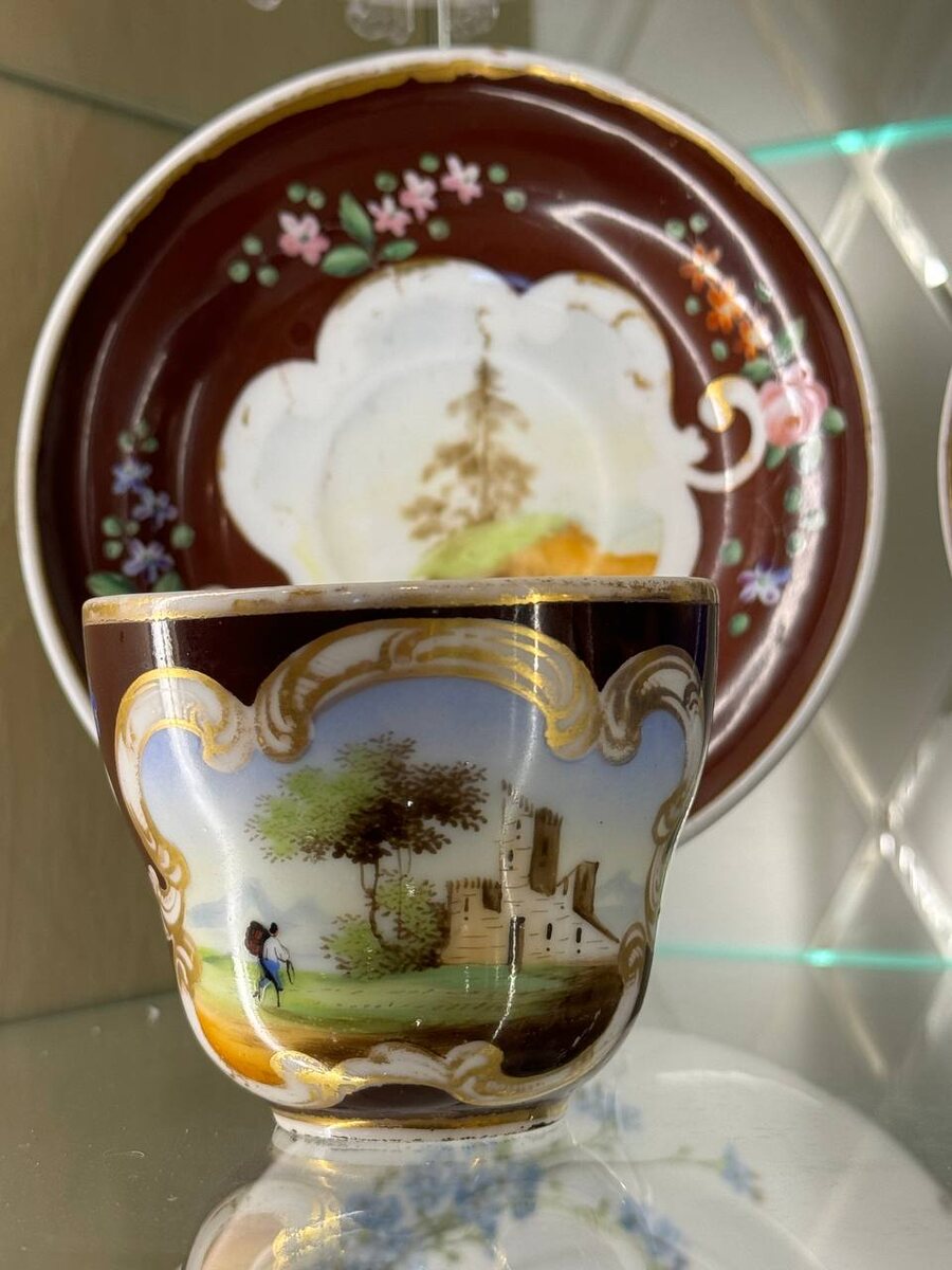 Реже встречаются предметы с рисунком, окантованным золоченой рамкой, выполненным на фоне белоснежного фарфора, как на двух фото ниже.